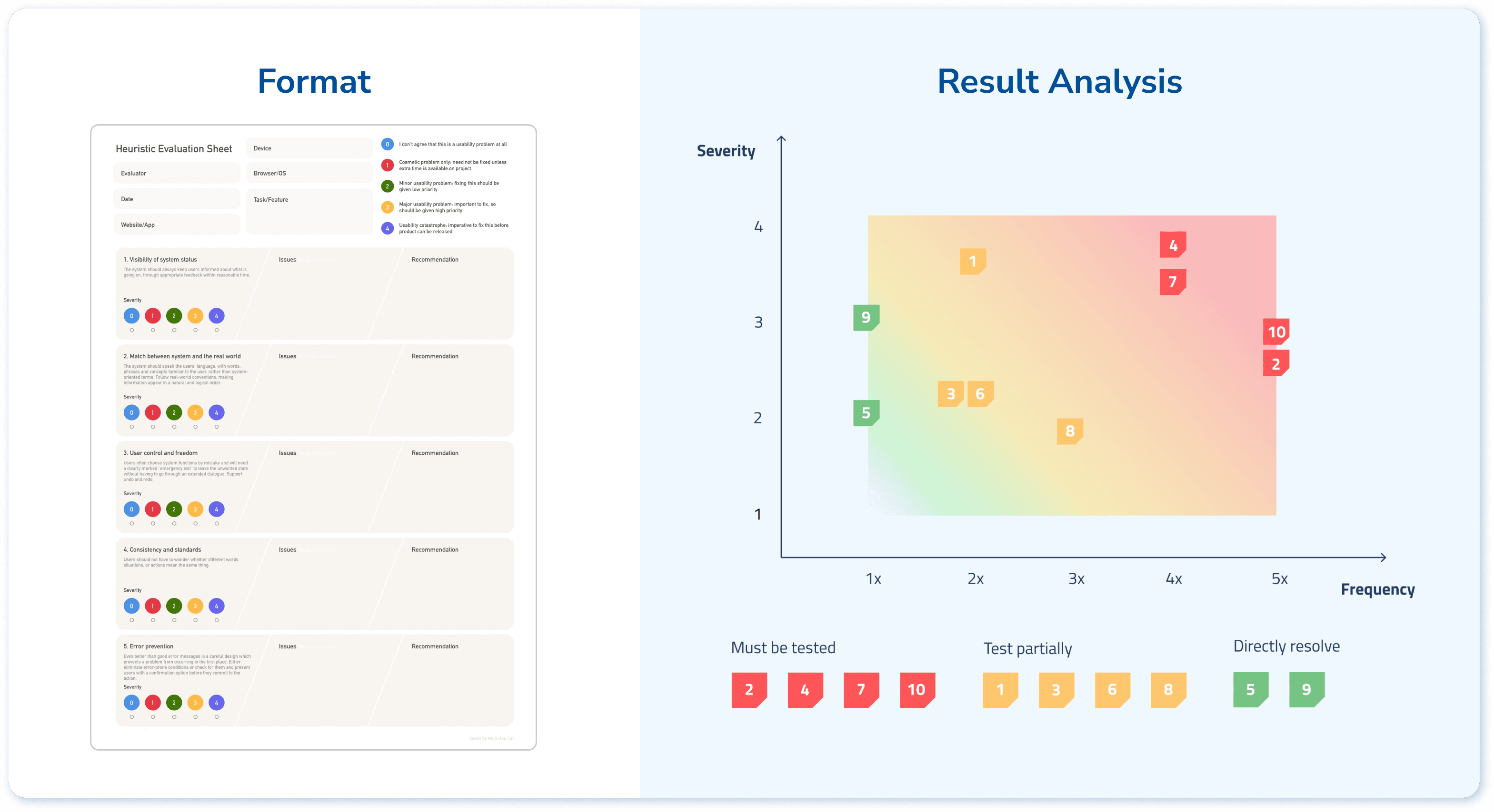 To make strategic decision about next step, I mapped the data collected out in terms of times of identification (frequency) and severity level, which allows us to identify the serious ones that are worth of testing within limited timeframe.