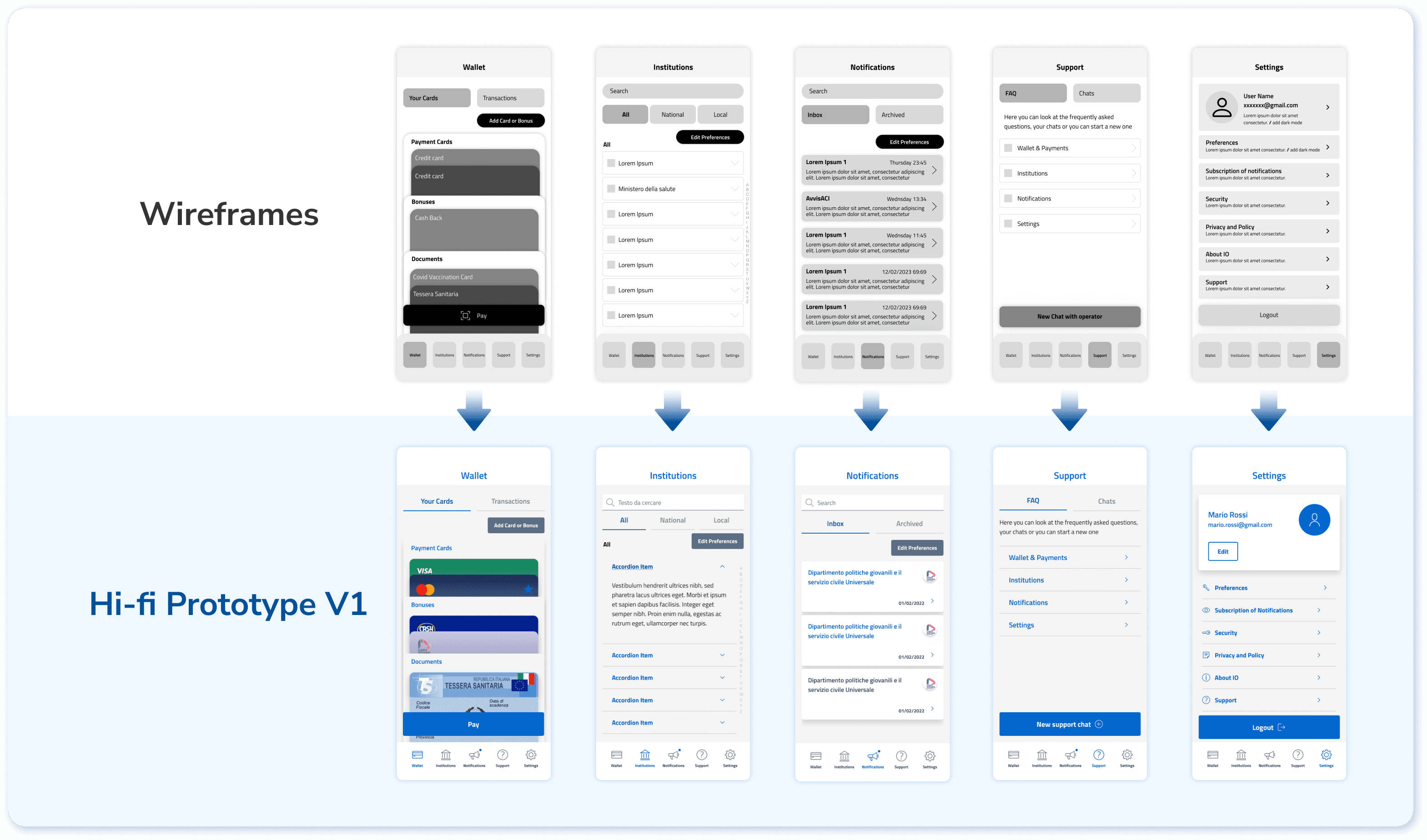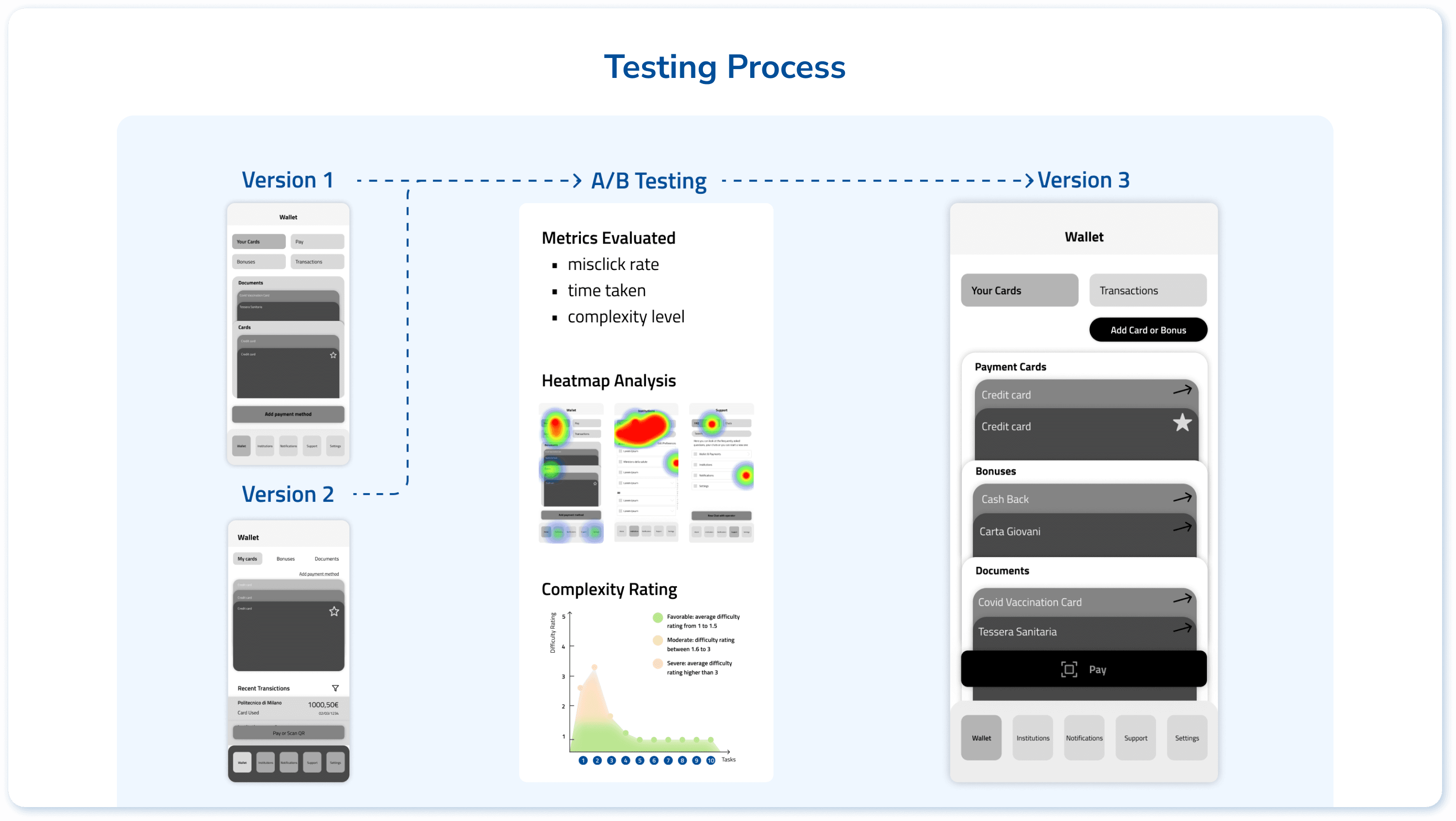 According to the defined information architecture, we prepared two versions of wireframes to compare their performance and synthesized the best practices into a final 3rd version. The testing protocol was the same as stage one, since the essential tasks are the same.