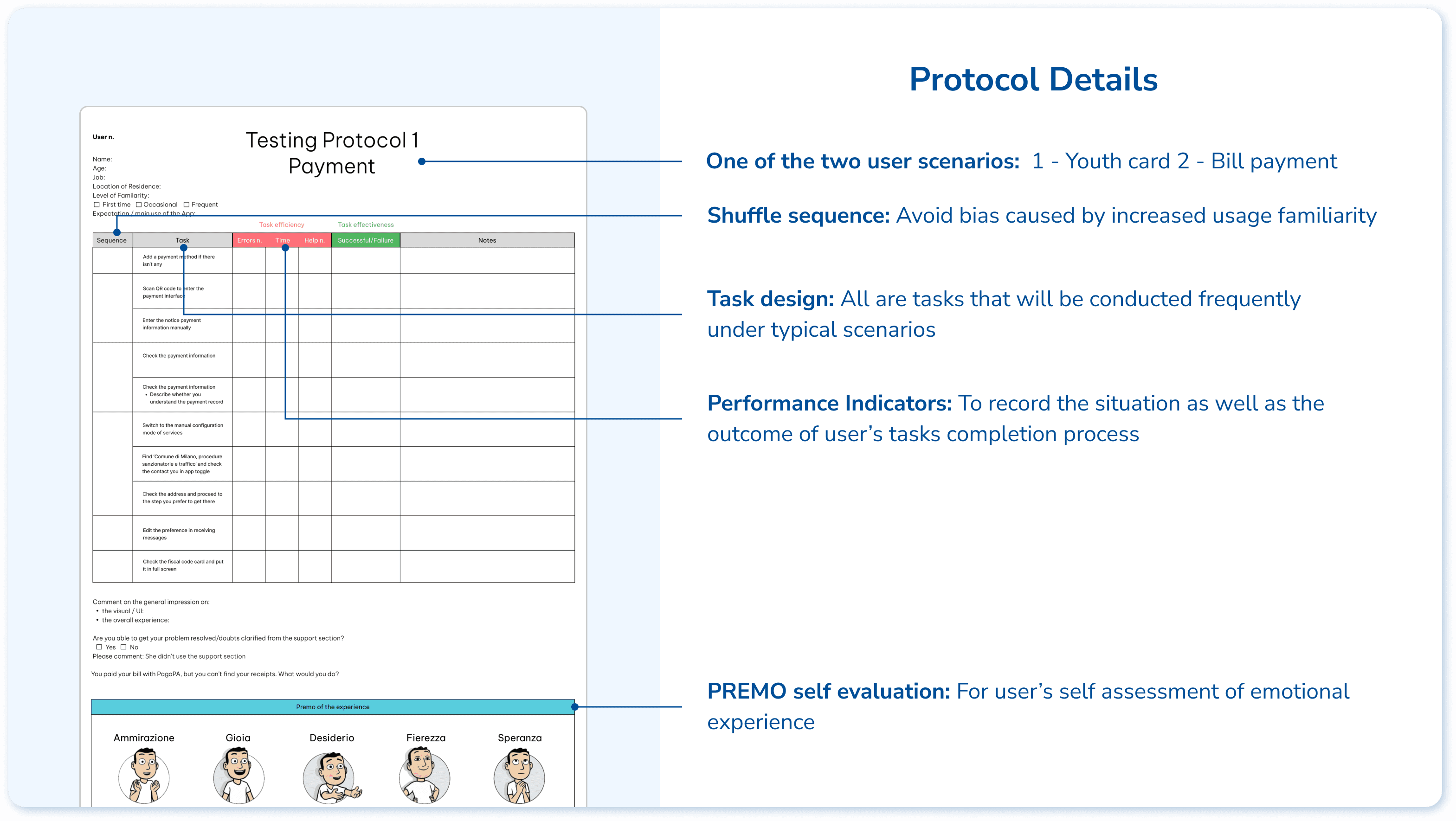 Based on the 2 typical user scenarios, the testing protocol is designed with 9 related tasks to evaluate the effectiveness, efficiency, and satisfaction of the user experience. We tested with 5 users in each scenario, with a mixture of first time users and occasional users.