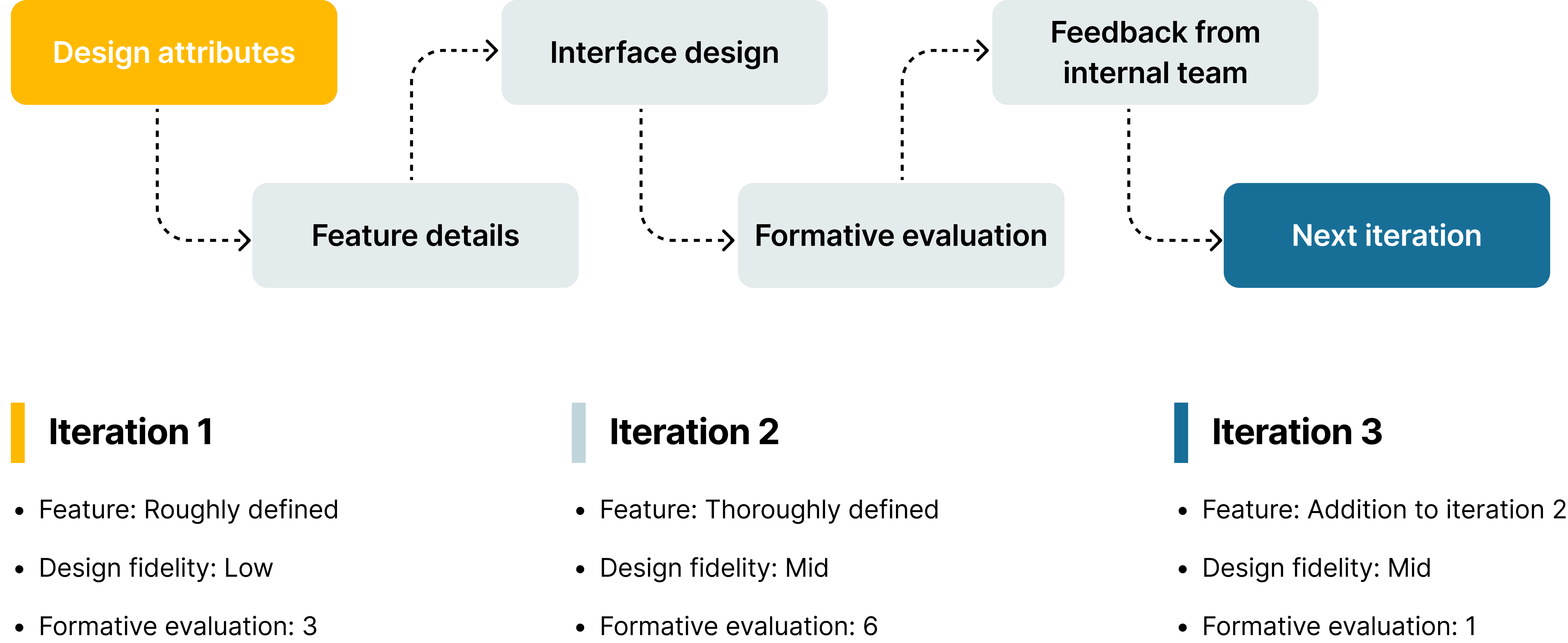 From iteration 1 to 2, there has been increased level of feature completion and interface fidelity, while iteration 3 focuses on a supplementary feature on top of iteration 2, so it is delivered and evaluated quickly.
