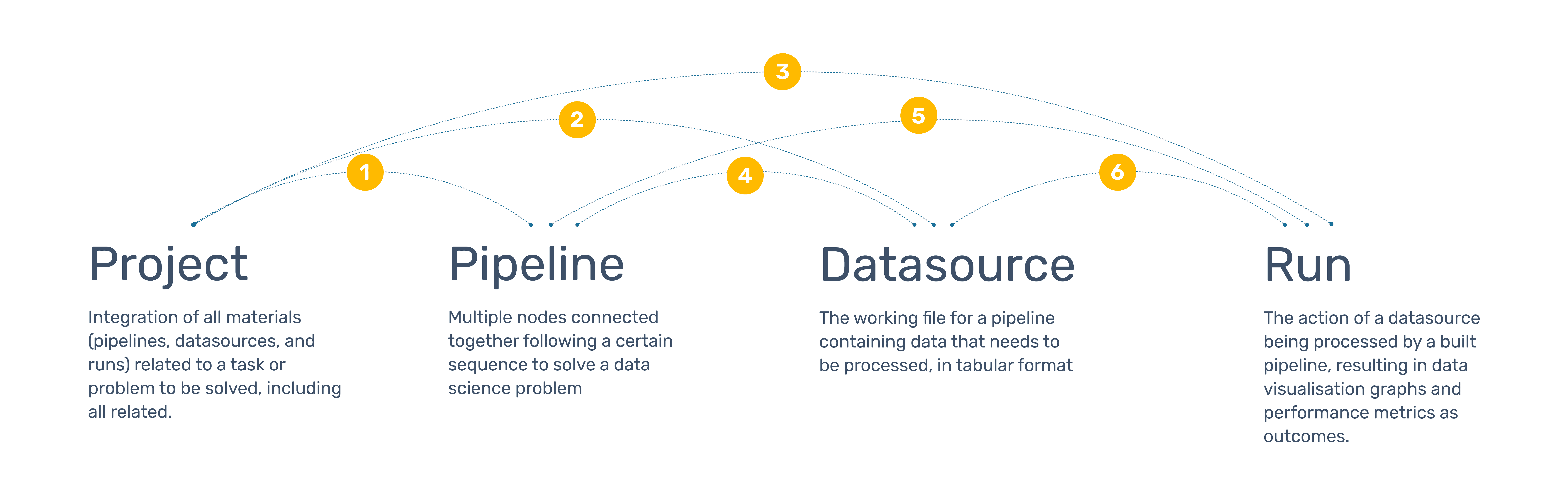 The design delivery needs to reflect the abstract relationship between the essential elements (project, pipeline, datasource, and run) to effectively assist asset navigation and control.